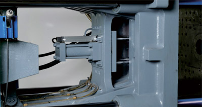 采用雙射移結(jié)構(gòu),前拉式射臺(tái)油缸,平行牽引,保護(hù)噴嘴與模具接觸不偏移密封佳,不易漏膠。